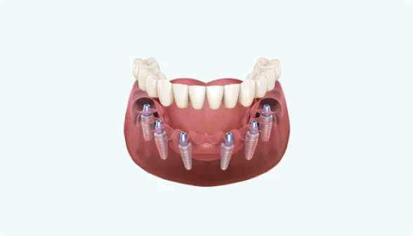 Если необходимо провести протезирование нижней челюсти методом ALL ON 6, может потребоваться подсадка костной ткани в области мандибулярного нерва, чтобы установить имплант по анатомии роста корня, а не под углом.